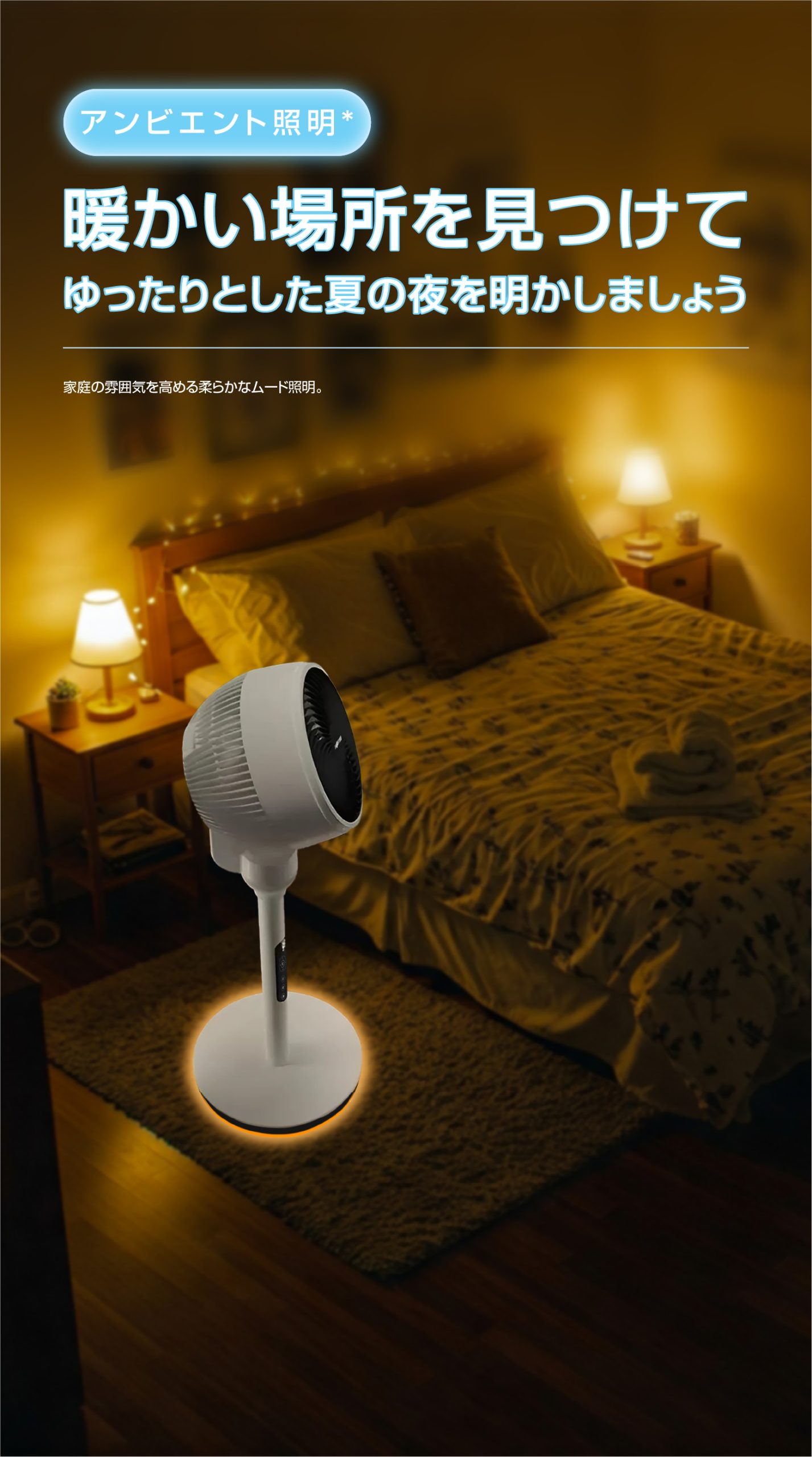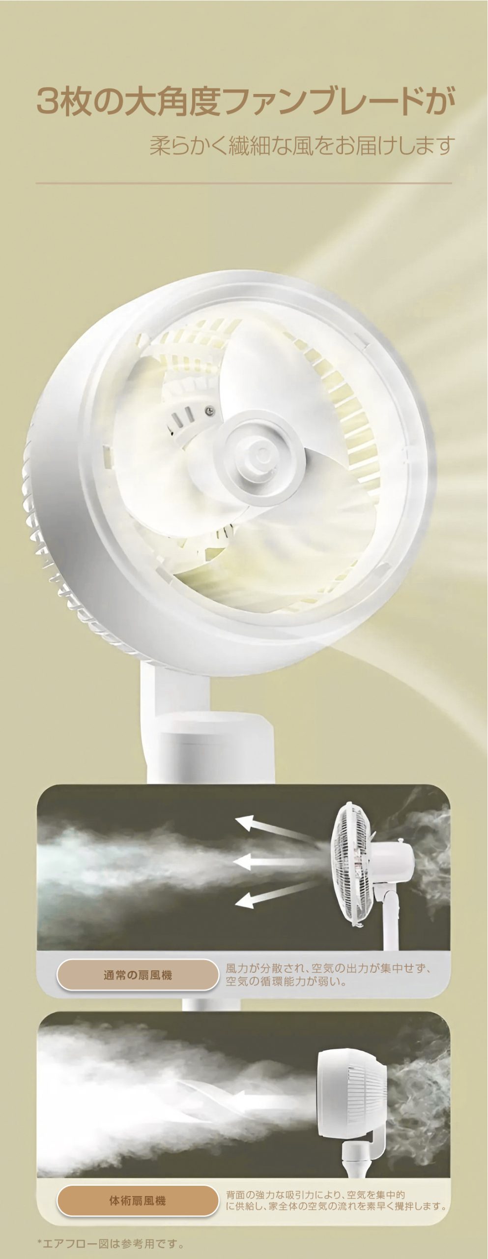 広い角度で設計された3枚羽根が、空気を効率よく取り込み、やさしく均一な風を生み出します。強すぎないのに、しっかり届く。自然に近い心地よさで、お部屋全体を包み込みます。通常の扇風機に比べ、風の集中力と循環効率が向上し、快適な空気の流れをサポートします。
