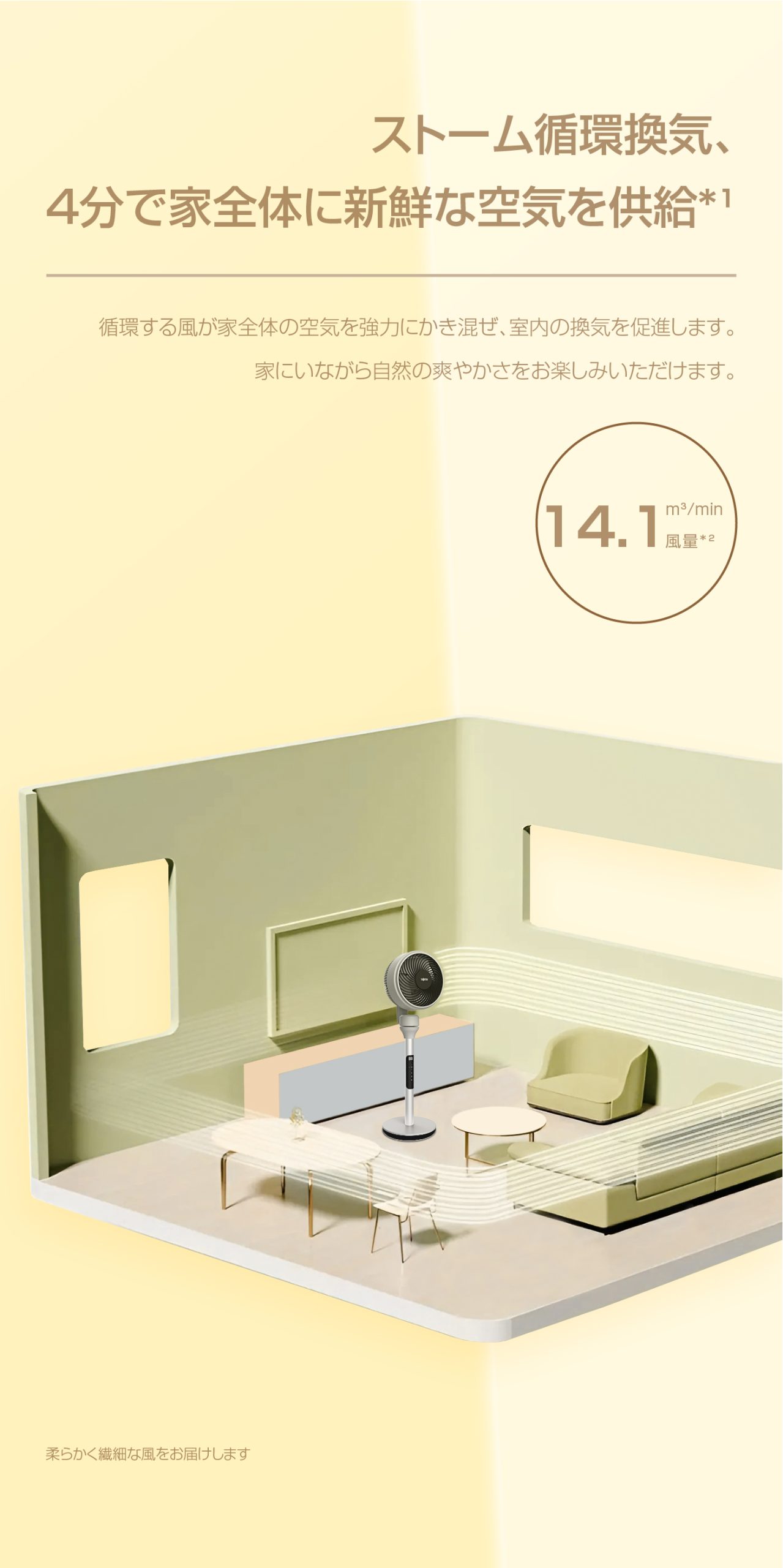 高性能モーターと独自の送風構造により、14.1㎥/分の大風量を実現。お部屋の隅々まで空気をかき混ぜ、こもった熱気をすばやく入れ替えます。窓を開けなくても、まるで森の中にいるような心地よさ。家のどこにいても、爽やかな風がやさしく包み込みます。